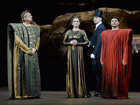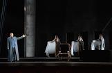 Пресс-показ опер "Эдип-царь" / "Замок герцога Синяя борода" в постановке режиссера Римаса Туминаса на сцене Московского академического музыкального театра имени К.С.Станиславского и В.И.Немировчиа-Данченко. Оперные певцы Роман Улыбин (слева), Наталья Зимина (вторая слева) и Евгений Либерман (справа) в опере композитора Игоря Стравинского "Эдип-царь".