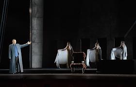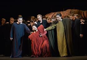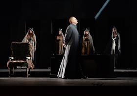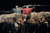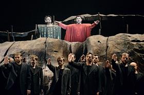 Пресс-показ опер "Эдип-царь" / "Замок герцога Синяя борода" в постановке режиссера Римаса Туминаса на сцене Московского академического музыкального театра имени К.С.Станиславского и В.И.Немировчиа-Данченко. Оперный певец Евгений Либерман (в центре) в опере композитора Игоря Стравинского "Эдип-царь".