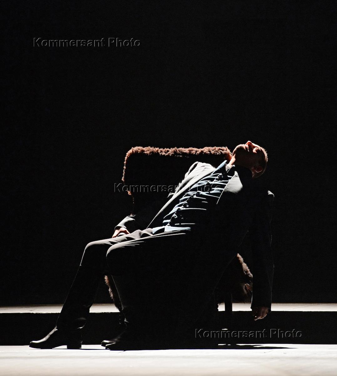 Пресс-показ опер "Эдип-царь" / "Замок герцога Синяя борода" в постановке режиссера Римаса Туминаса на сцене Московского академического музыкального театра имени К.С.Станиславского и В.И.Немировчиа-Данченко. Оперный певцец Роман Улыбин (слева) в опере композитора Игоря Стравинского "Эдип-царь".