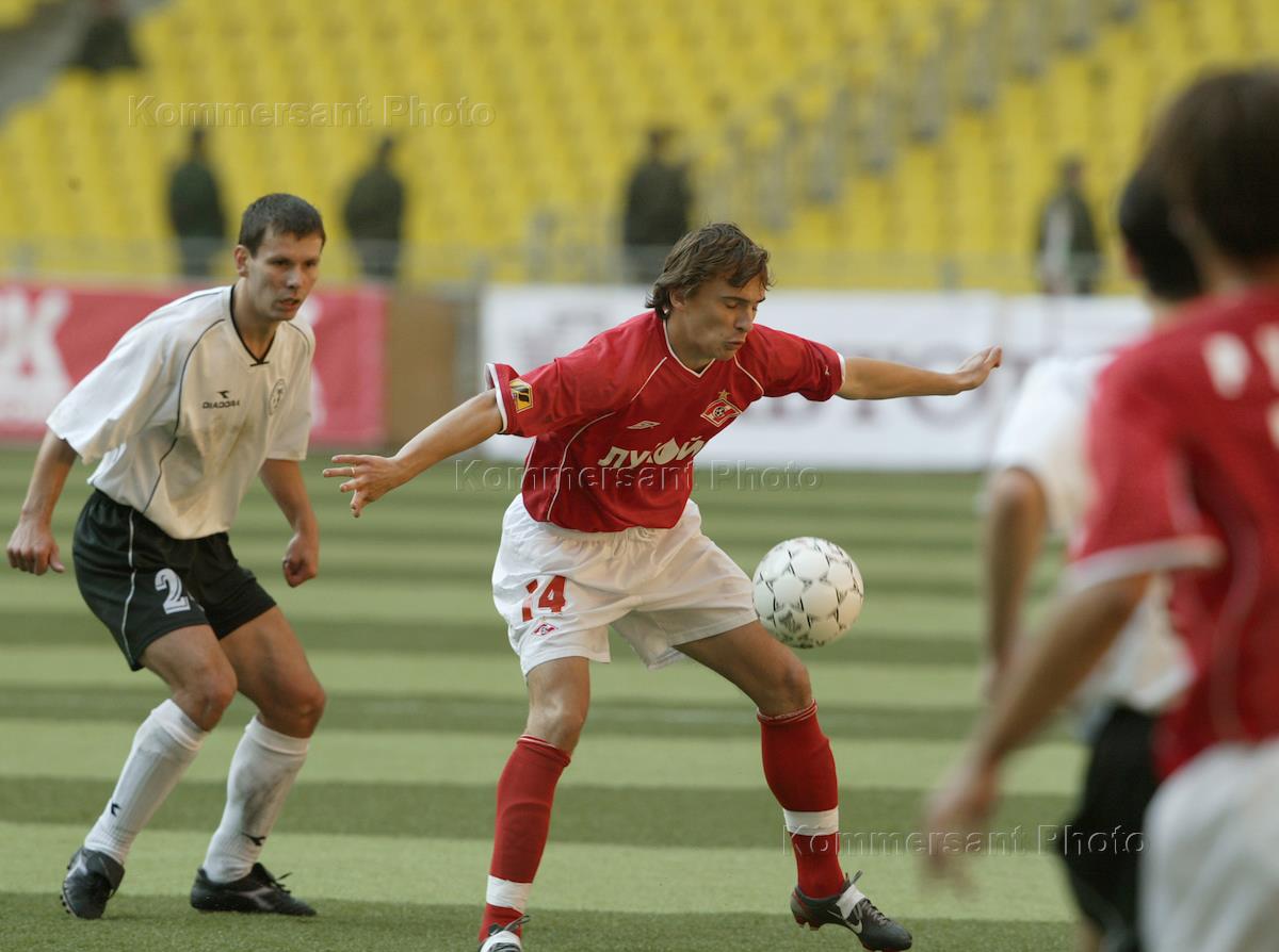 Half-back of Spartak Maxim Kalinichenko (centre) performs during the Spartak-Torpedo match played on the Luzhniki Stadium.