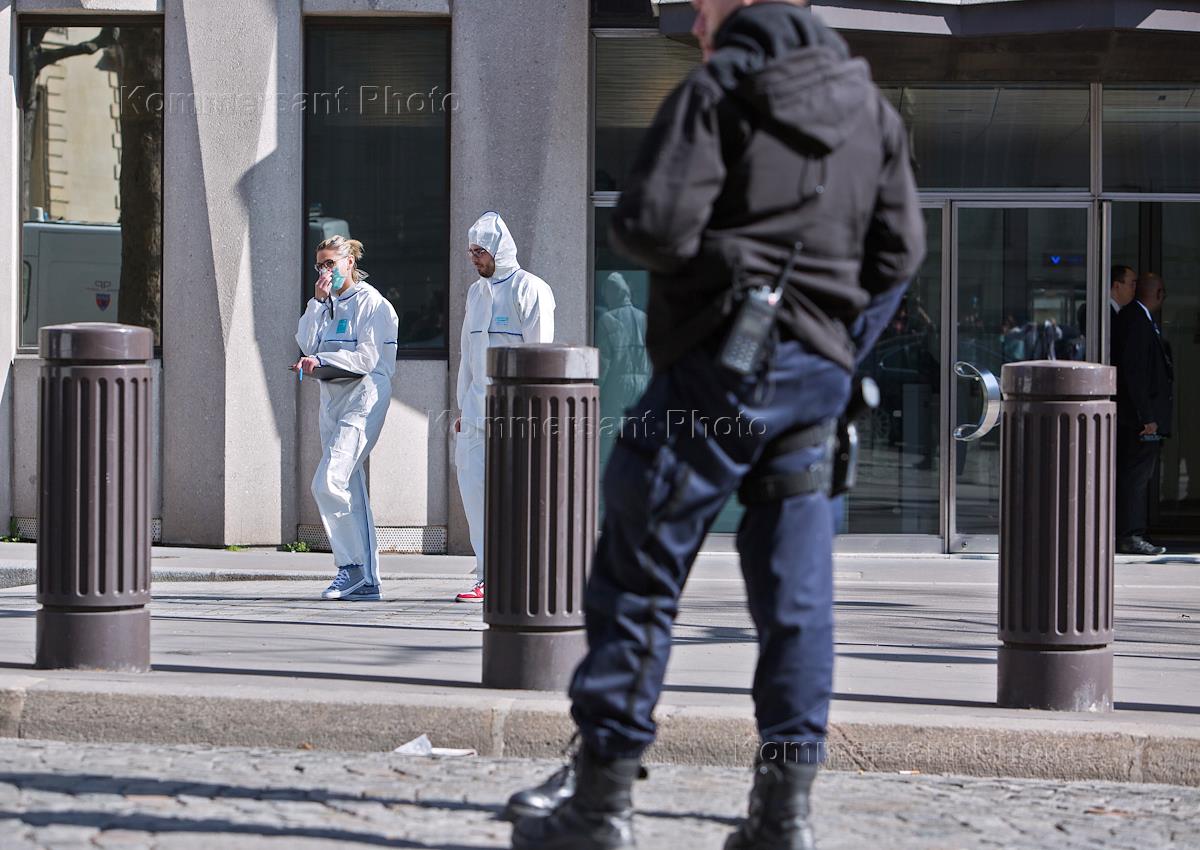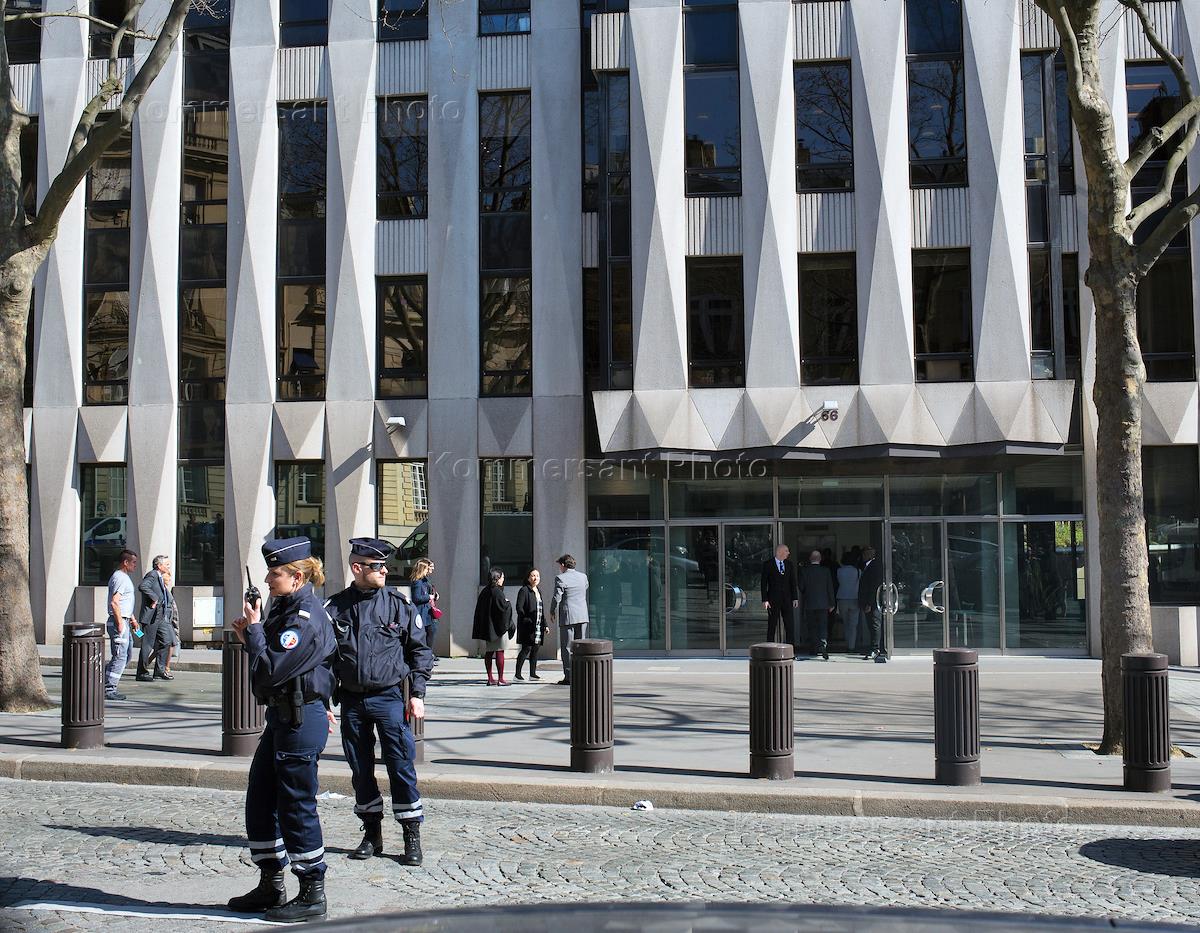 Сотрудники правоохранительных органов Парижа на месте взрыва в здании Международного валютного фонда (МВФ) на Авеню Иена, дом 66.