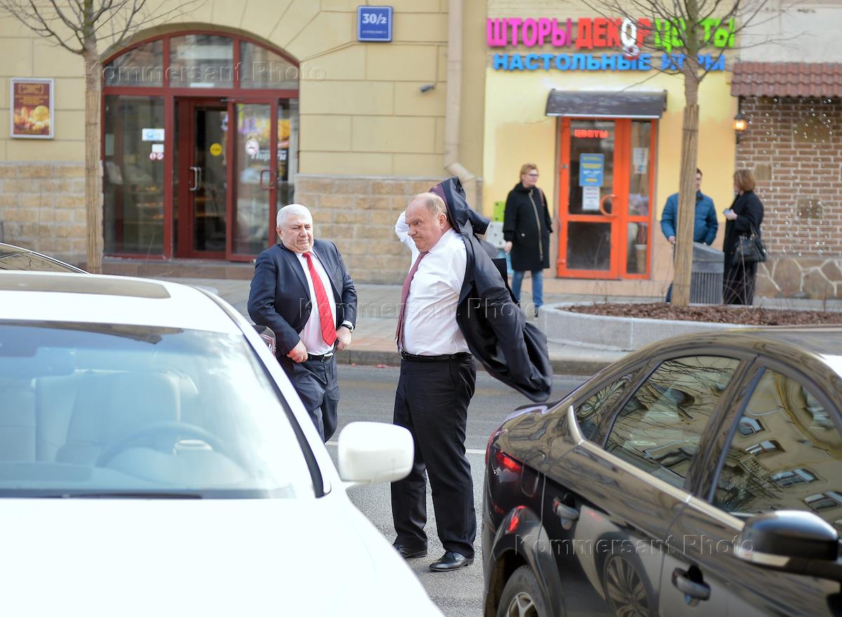 Лидер КПРФ, член комитета Государственной думы (ГД) по делам Содружества Независимых Государств, евразийской интеграции и связям с соотечественниками Геннадий Зюганов (в центре) перед началом пресс-конференции на тему "Россия: три года после возвращения Крыма. Оценки, выводы и предложения КПРФ". Пресс-конференция прошла в офисе "Интерфакс".