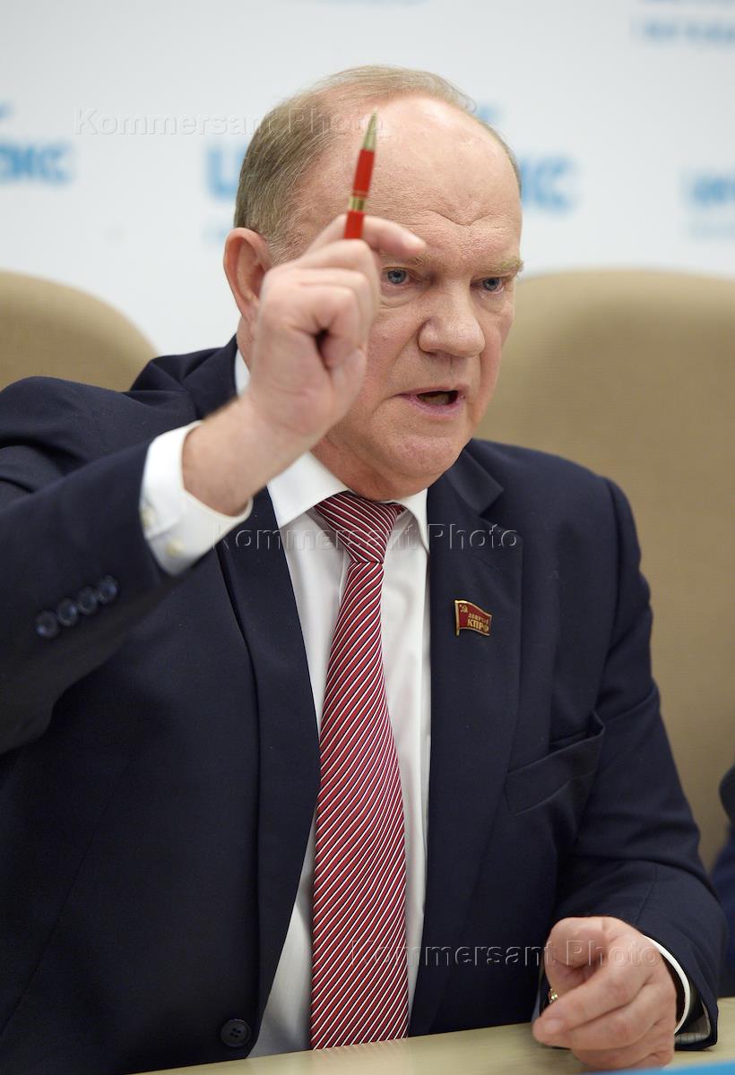 Лидер КПРФ, член комитета Государственной думы (ГД) по делам Содружества Независимых Государств, евразийской интеграции и связям с соотечественниками Геннадий Зюганов во время пресс-конференции на тему "Россия: три года после возвращения Крыма. Оценки, выводы и предложения КПРФ". Пресс-конференция прошла в агентстве "Интерфакс".