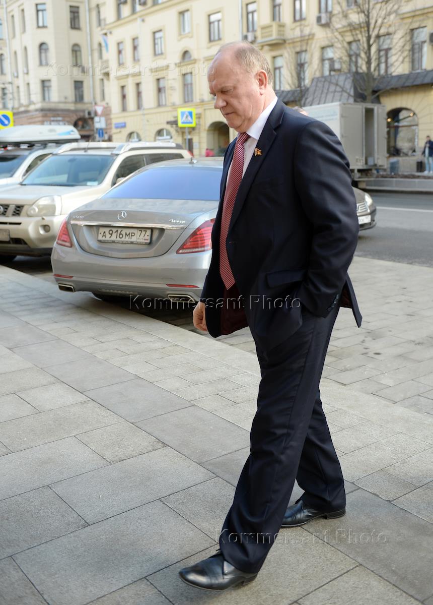 Лидер КПРФ, член комитета Государственной думы (ГД) по делам Содружества Независимых Государств, евразийской интеграции и связям с соотечественниками Геннадий Зюганов (в центре) перед началом пресс-конференции на тему "Россия: три года после возвращения Крыма. Оценки, выводы и предложения КПРФ". Пресс-конференция прошла в офисе "Интерфакс".
