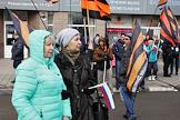 Митинг по случаю третьей годовщины присоединения Крыма к России. Группа участников с флагами Национально-освободительного движения и участник, разворачивающий флаг "Единой России", перед началом митинга.