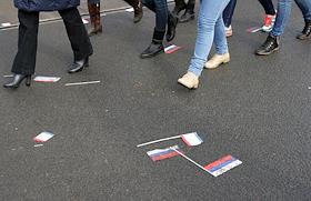 Митинг по случаю третьей годовщины присоединения Крыма к России. Флажки России, затоптанные участниками митинга, на асфальте.