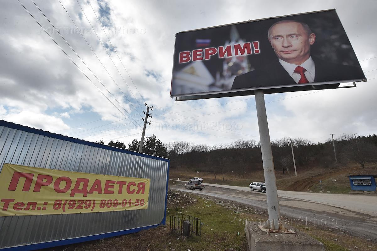 Жанровая фотография. Плакат с портретом президента России Владимира Путина и надписью "Верим!".