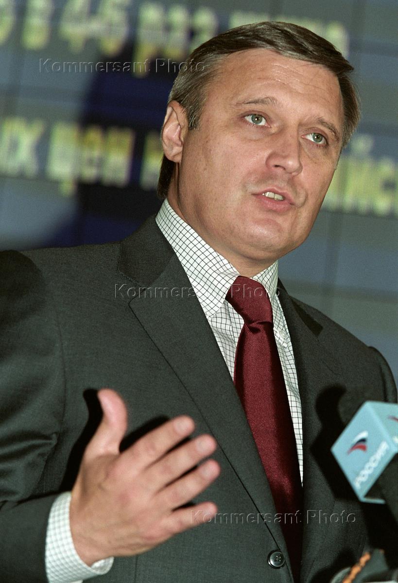 Russian Press Minister Mikhail Lesin (centre) and his first deputy Mikhail Seslavinsky (left) attend the exhibition "300 years of the russian journalistics - 300 years of russian history" that was held in the "Manezh" exhibition hall.