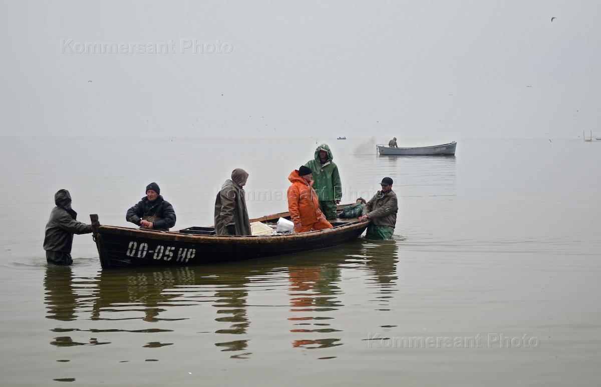 Рыбный промысел Донецкой Народной Республики на Азовском море. Рыбаки с дневным уловом в лодке.