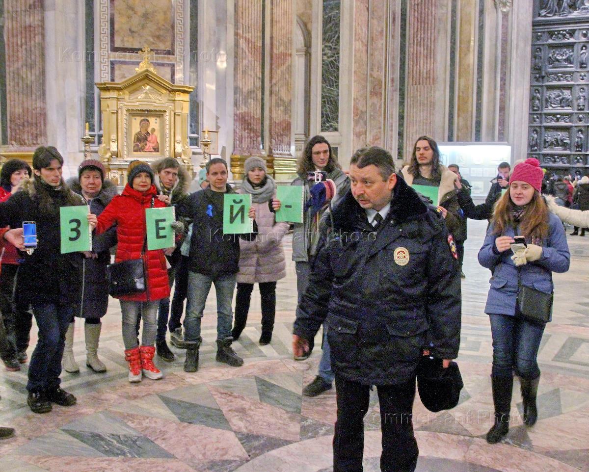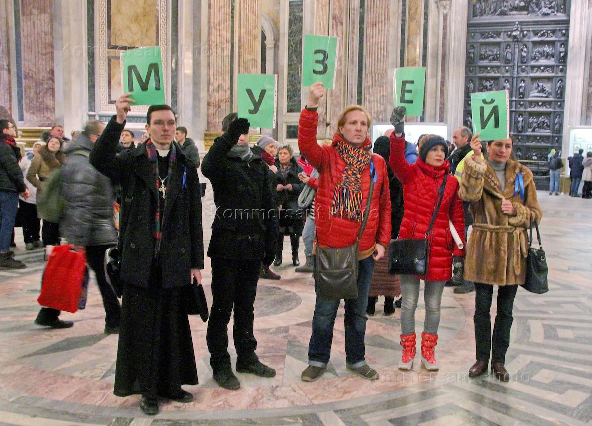 Акция в поддержку музея Исаакиевского собора, против передачи собора Русской православной церкви (РПЦ), прошла в Исаакиевский собор. Активисты выстроиллись в быквами, обазовав лозунг "Музей - городу". Акция организована оппозиционным активистом Динаром Идрисовым.