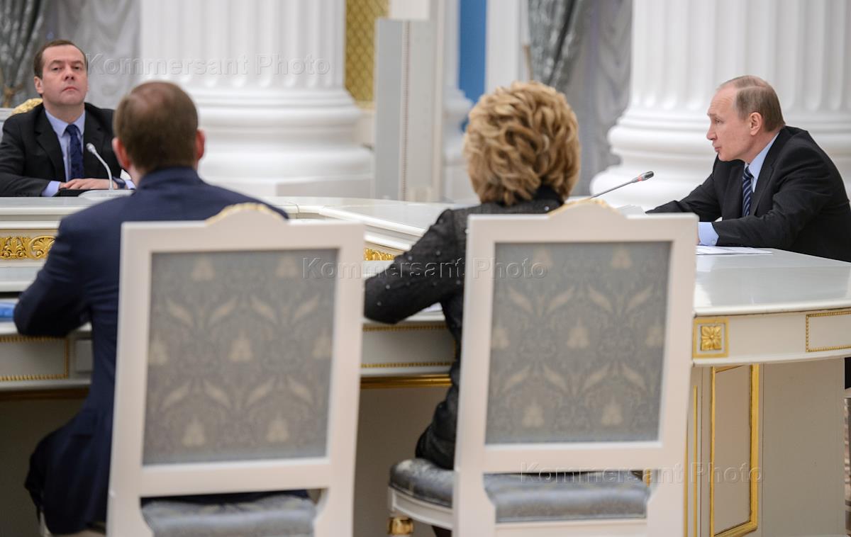 Заседание президиума Совета при президенте России по стратегическому развитию и приоритетным проектам. Слева направо: министр здравоохранения России Вероника Скворцова, председатель совета фонда Центра стратегических разработок, заместитель председателя Экономического совета при президенте России Алексей Кудрин, председатель Счетной палаты Татьяна Голикова, министр промышленности и торговли России Денис Мантуров, заместитель председателя правительства России Аркадий Дворкович, полномочный представитель Президента Российской Федерации в Сибирском федеральном округе Сергей Меняйло и полномочный представитель президента в Приволжском федеральном округе Михаил Бабич перед началом заседания в Кремле.