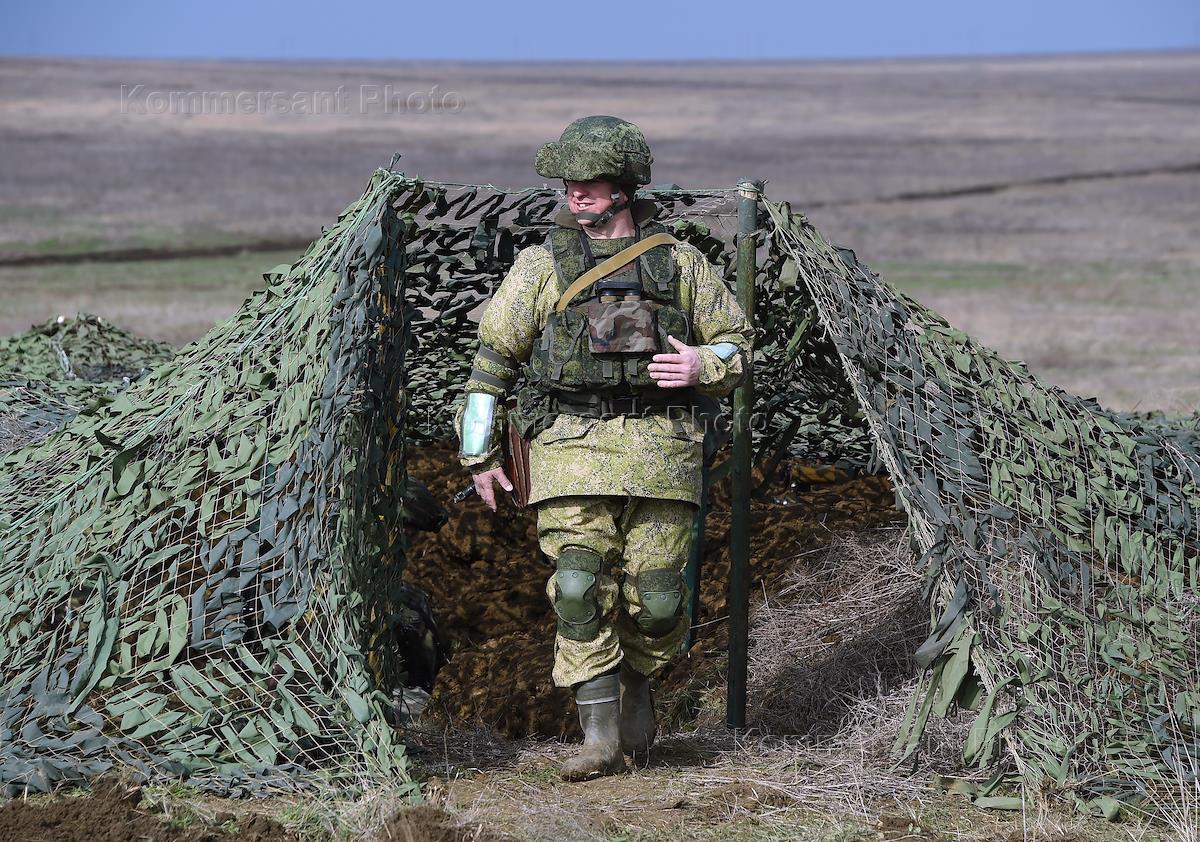 Командно-штабные учения Воздушно-десантных войск на полигоне Опук. Военнослужащие Вооруженных сил России во время учений. Бойцы в окопе.