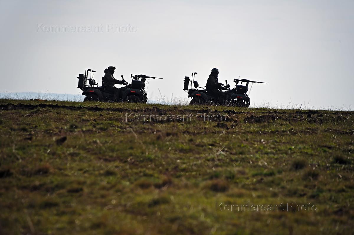 Командно-штабные учения Воздушно-десантных войск на полигоне Опук. Военнослужащие Вооруженных сил России во время учений. Робот.