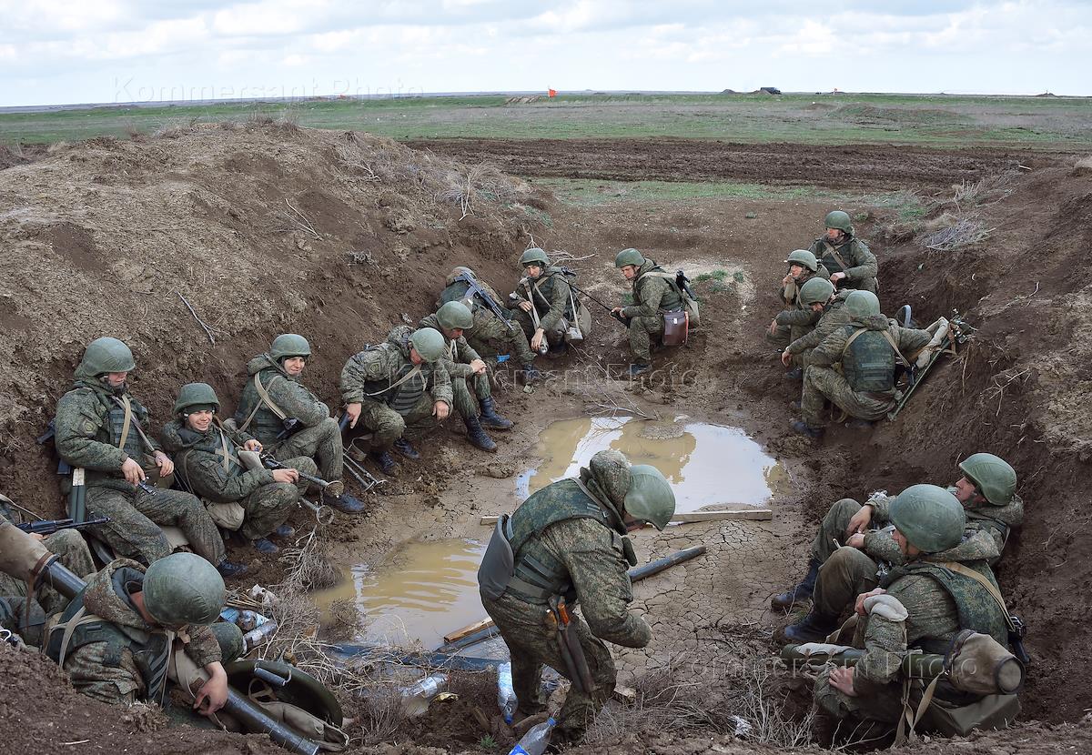 Командно-штабные учения Воздушно-десантных войск на полигоне Опук. Военнослужащие Вооруженных сил России во время учений. Бойцы в окопе.