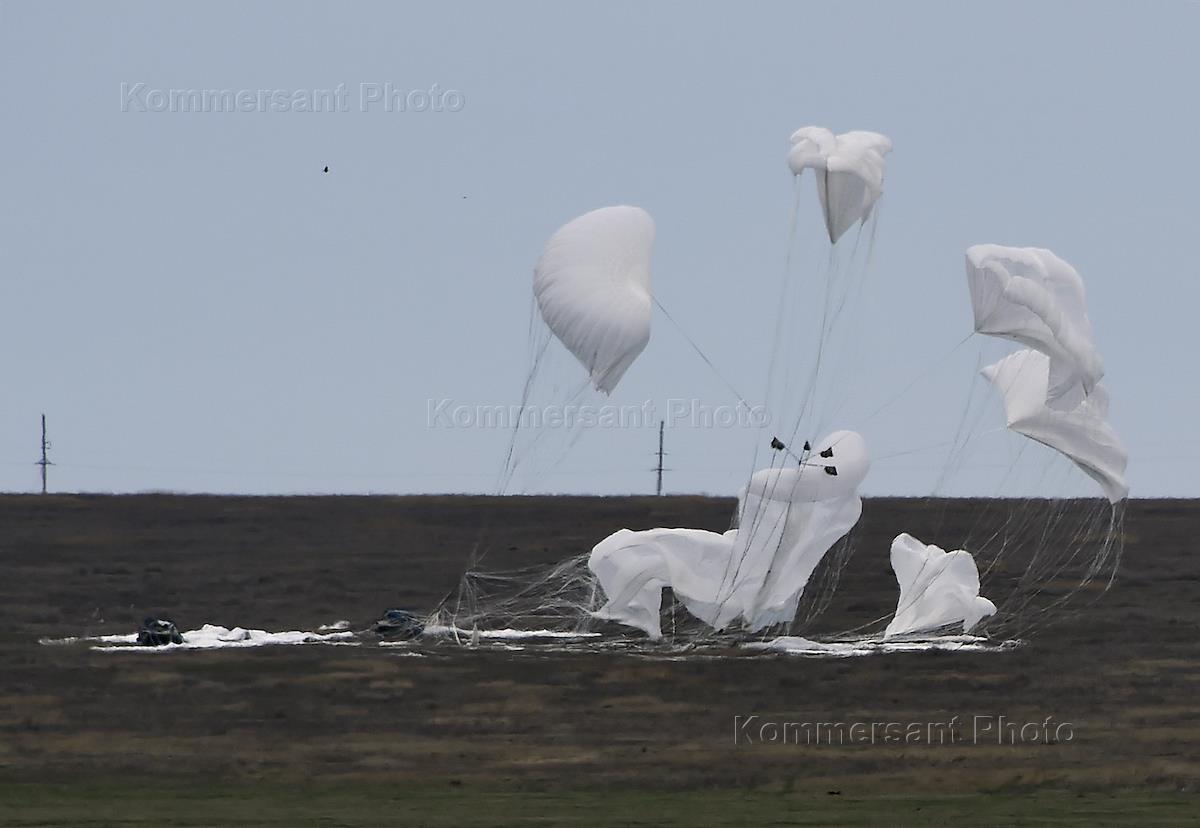 Командно-штабные учения Воздушно-десантных войск на полигоне Опук. Военнослужащие Вооруженных сил России во время учений. Приземление десанта с неба.
