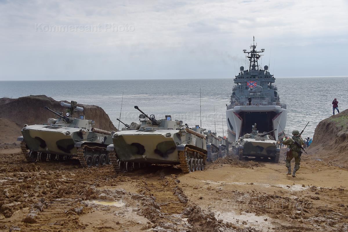 Командно-штабные учения Воздушно-десантных войск на полигоне Опук. Военнослужащие Вооруженных сил России во время учений. Высадка войск с моря.