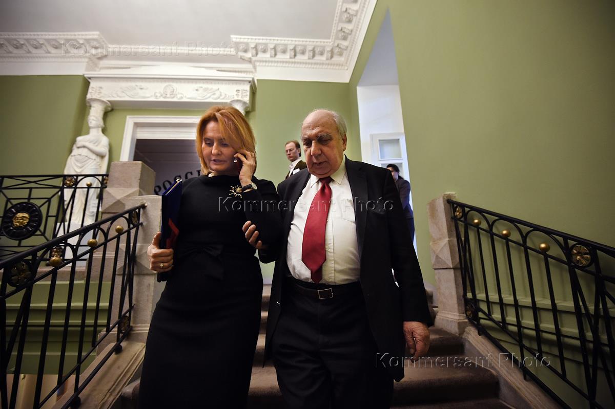 Пресс-показ выставки "1917. Код революции" в Государственном центральном музее современной истории России. Директор Государственного центрального музея современной истории России Ирина Великанов (слева) и директор Института всеобщей истории РАН Александр Чубарьян (справа) во время осмотра выставки.
