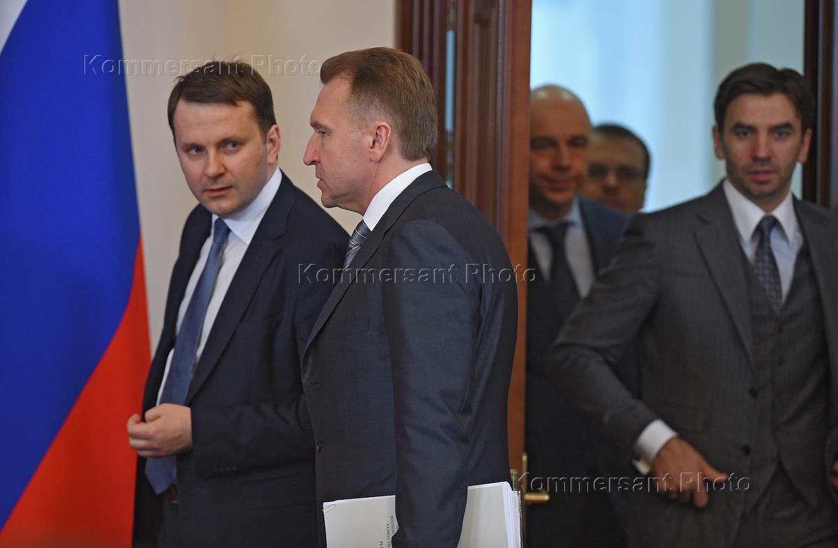 Заседание президиума совета при президенте по стратегическому развитию и приоритетным проектам. Министр экономического развития России Максим Орешкин (слева) и первый заместитель председателя правительства России Игорь Шувалов (в центре) перед началом заседания.