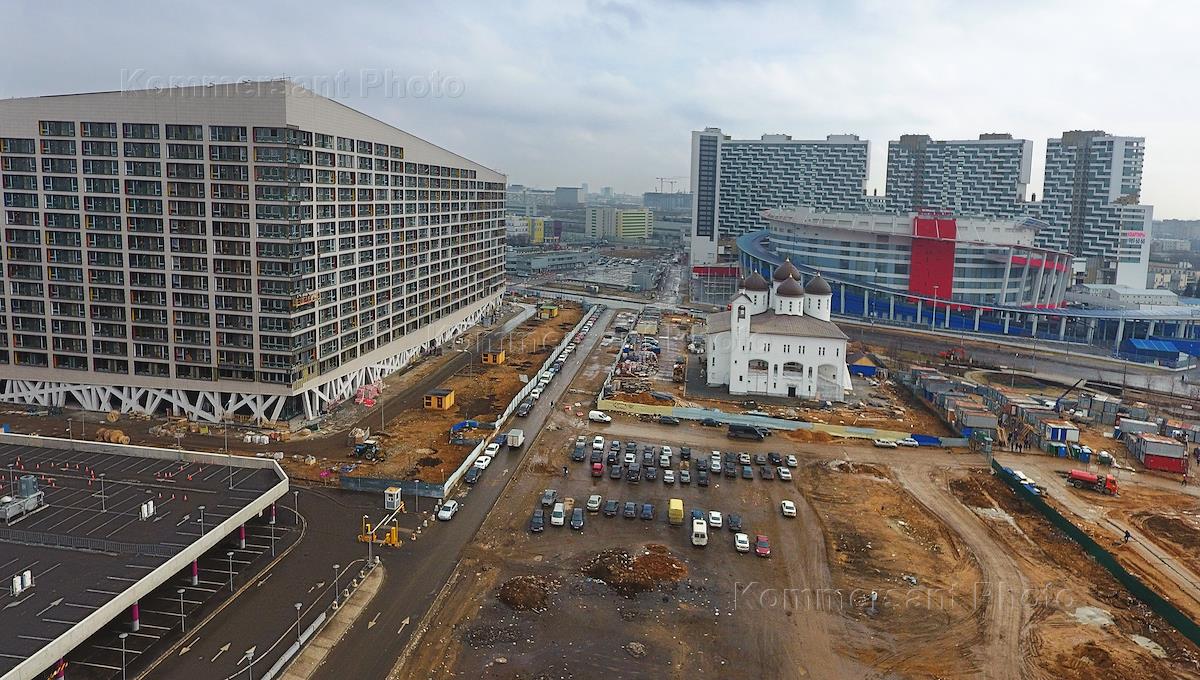 Виды Москвы. Жилой комплекс (ЖК) "Лайнер", Храмовый комплекс Святого Преподобного Сергия Радонежского и дворец спорта "Мегаспорт" на Ходынском поле.