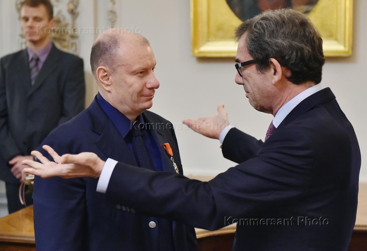 Церемония вручения ордена Почетного легиона деятелям культуры в посольстве Франции. Президент компании "Интеррос" Владимир Потанин (справа) во время церемонии.