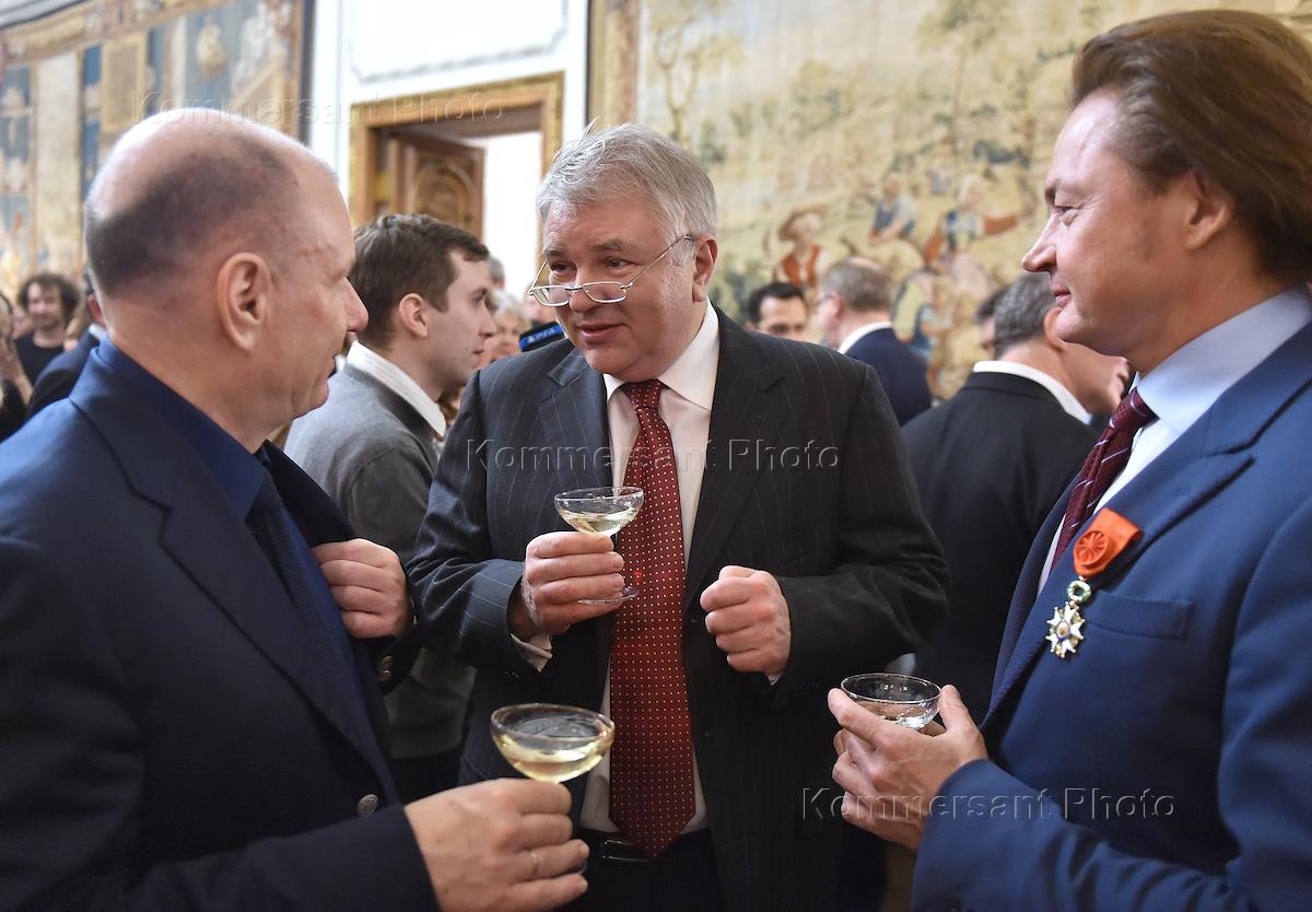 Церемония вручения ордена Почетного легиона деятелям культуры в посольстве Франции. Слева направо: президент компании "Интеррос" Владимир Потанин, заместитель министра иностранных дел России Алексей Мешков и коллекционер, основатель культурного фонда "Екатерина" Владимир Семенихин во время церемонии.