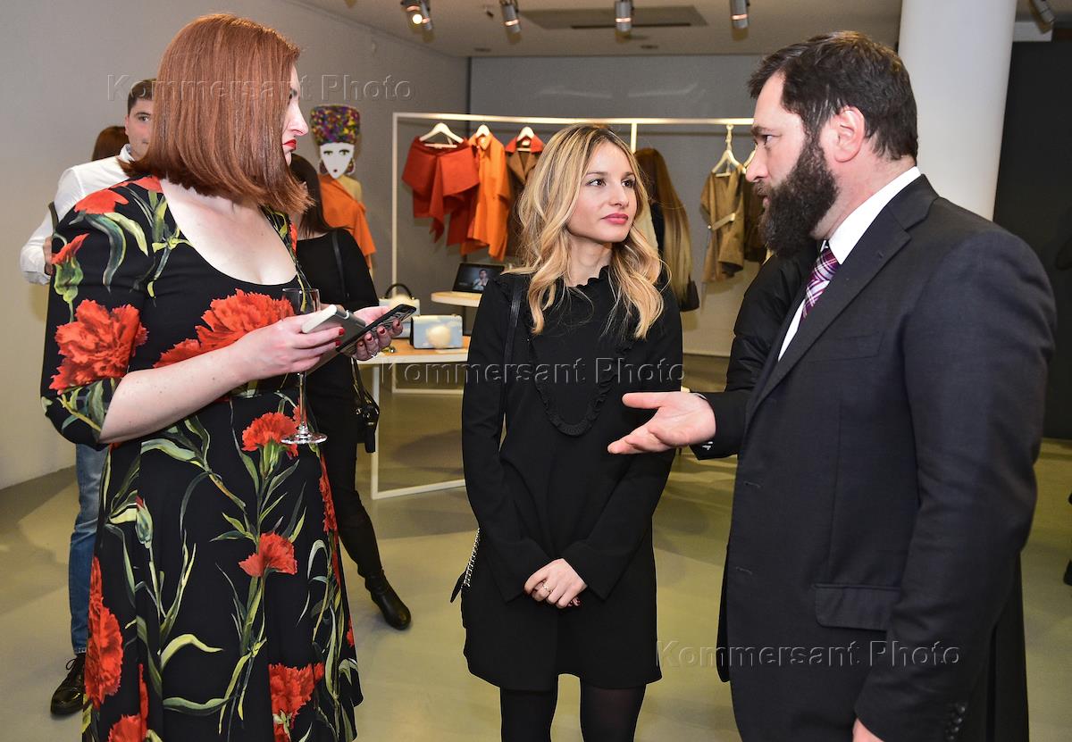 Церемония открытия однодневной экспозиции под названием "Ключ, построенный волной от замкнутого моря", совместного арт-проекта компании Alcantara, производителя запатентованного одноименного материала, и российского художника и экспериментатора Андрея Бартенева. Экспозиция представлена в галерее актуального искусства RuArts. Музыкант Сергей Воронов (в центре) и художник Андрей Бартенев (справа) во время церемонии.