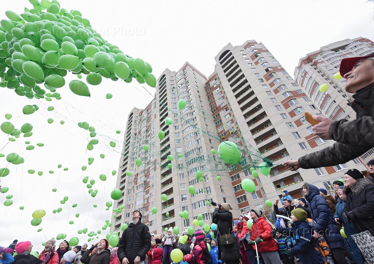 Акция, флешмоб "Зеленые шарики" проведенная жителями жилого комплекса ЖК "Ладожский парк" против изменений плана строительства "Восточной Скоростной Хорды" (ВСД).