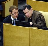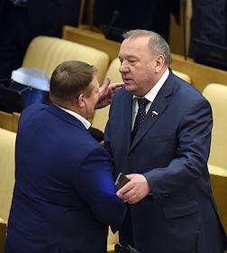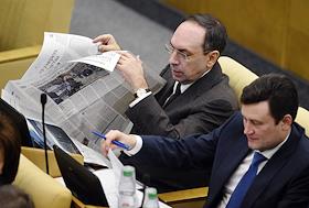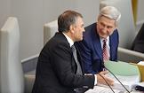 Пленарное заседание Государственной думы (ГД) России. Заместитель председателя комитета ГД России по безопасности и противодействию коррупции Анатолий Выборный (слева) и первый заместитель председателя комитета ГД по конституционному законодательству и государственному строительству Вячеслав Лысаков (справа) во время заседания.