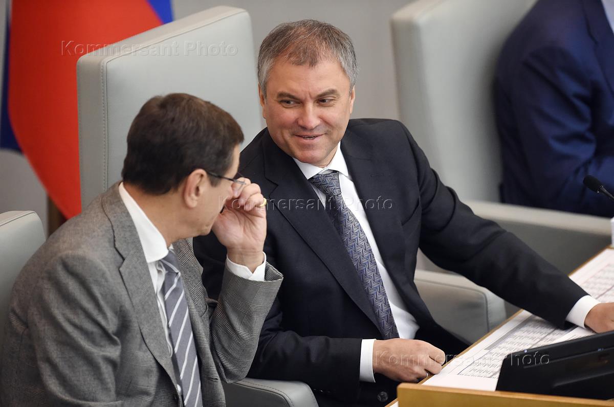 Пленарное заседание Государственной думы (ГД) России. Председатель ГД России Вячеслав Володин (слева) и его первый заместитель Иван Мельников (справа) во время заседания.