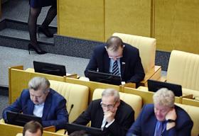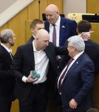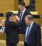 Пленарное заседание Государственной думы (ГД) России. Первый заместитель председателя комитета ГД России по делам национальностей Михаил Старшинов (в центре) перед началом заседания.