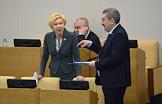 Пленарное заседание Государственной думы (ГД) России. Член комитета ГД России по государственному строительству и законодательству Ольга Баталина (в центре) и председатель комитета ГД России по бюджету и налогам Андрей Макаров (справа) во время заседания.