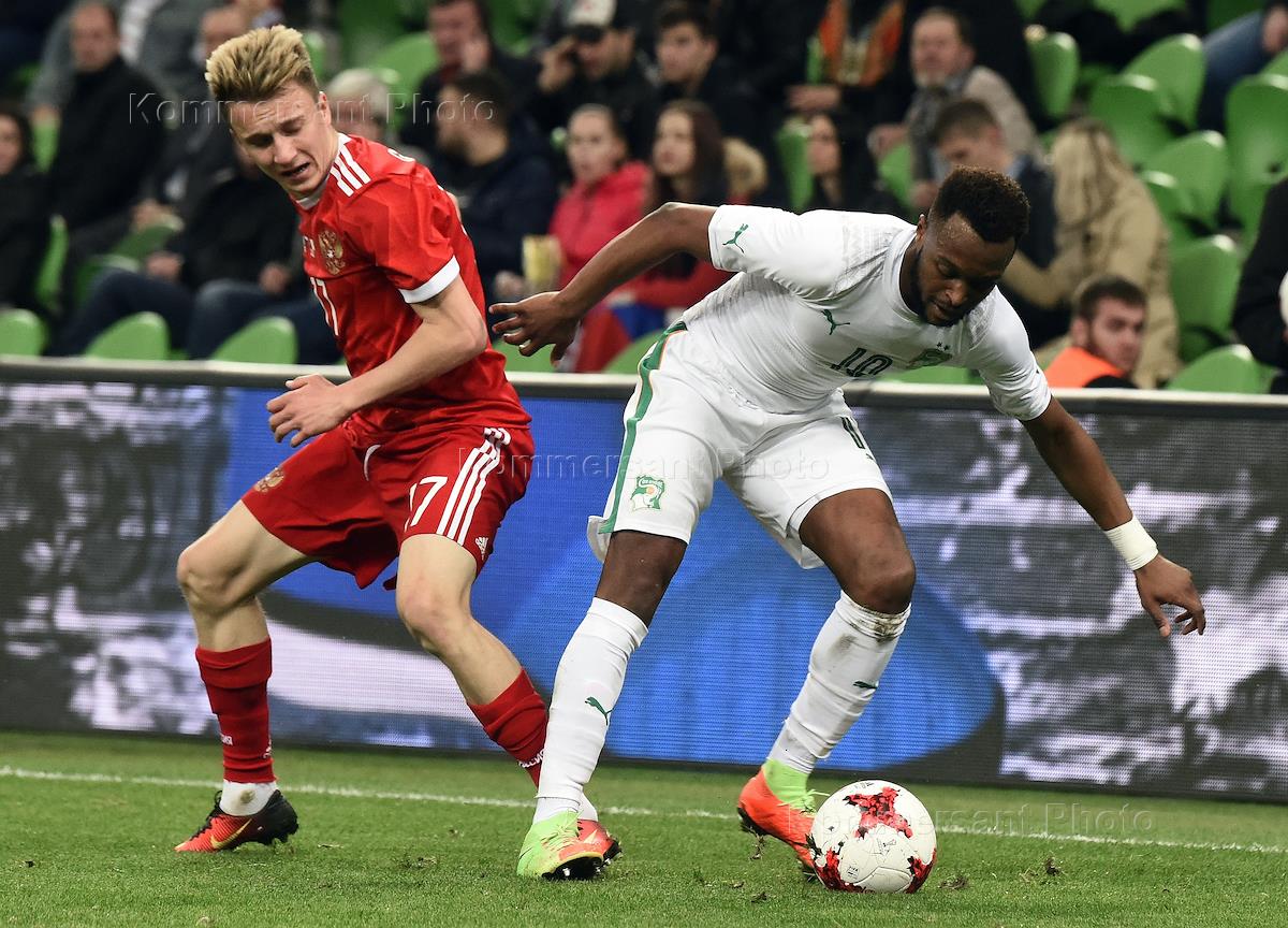 Товарищеский матч национальных сборных России и Кот-д'Ивуара на стадионе "Краснодар". Игрок сборной России Александр Головин (слева) во время матча.