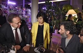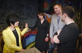 Коктейль с директором Музея современного искусства Токио, куратором основного проекта VII Московской биеннале современного искусства Юко Хасэгава в кафе "Март". Слева направо: ректор Института живописи, скульптуры и архитектуры имени И.Е.Репина Семен Михайловский, директор Музея современного искусства Токио, куратор основного проекта VII Московской биеннале современного искусства Юко Хасэгава и дизайнер Игорь Гурович во время коктейля.