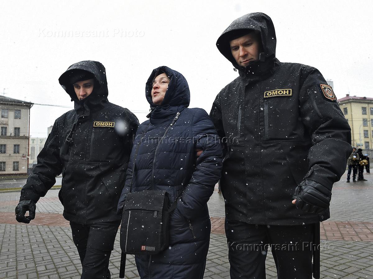 Акция белорусской оппозиции "День Воли", посвященная 99-летию образования в 1918 году Белорусской Народной Республики. Сотрудники ОМОН во время задержания участницы акции.