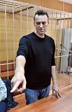 Оппозиционер Алексей Навальный (справа), задержанный за организацию несанкционированной акции против коррупции, во время рассмотрения его административного дела в Тверском районном суде.