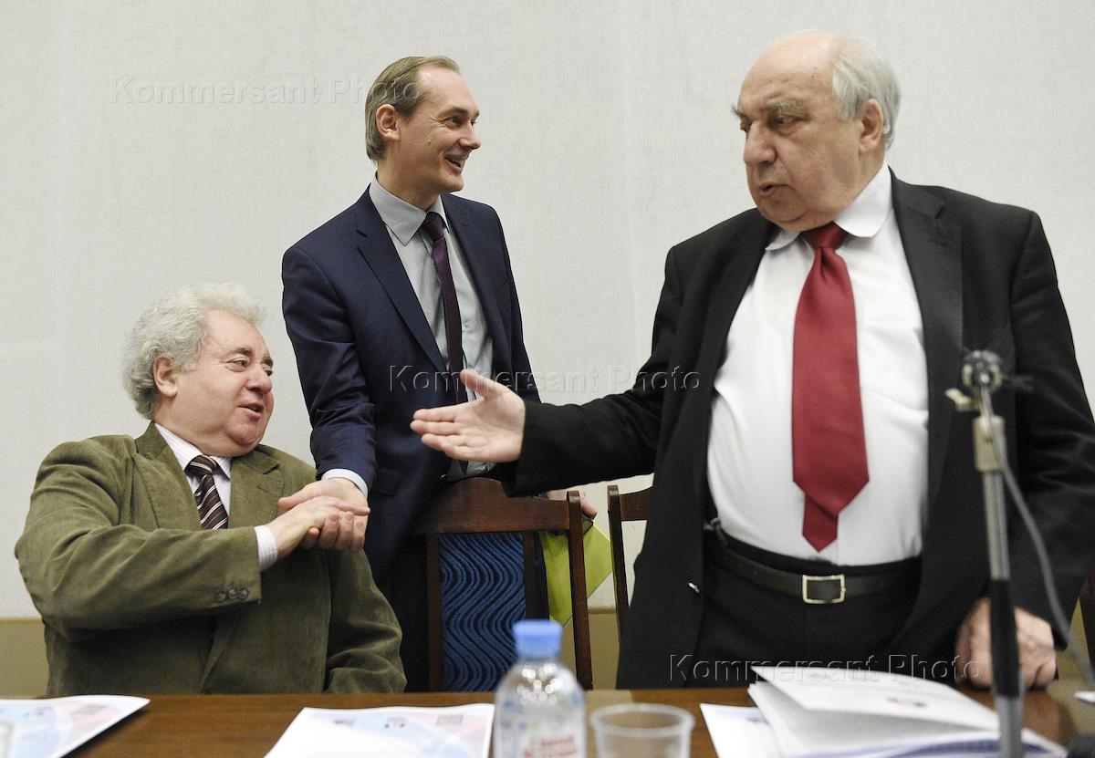 Всероссийская конференция "Стратегии преподавания истории в общеобразовательной школе". Слева направо: ректор Российского государственного гуманитарного университета (РГГУ) Ефим Пивовар, ответственный секретарь Российского исторического общества Андрей Петров и директор Института всеобщей истории РАН Александр Чубарьян во время конференции в Президентском зале нового здания Президиума РАН.