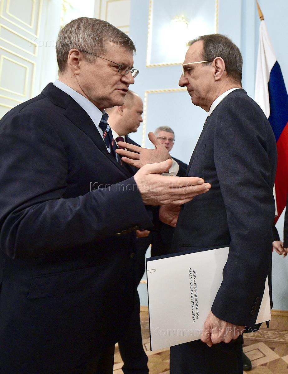 Ежегодная встреча генерального прокурора России Юрия Чайки с членами Общественной палаты России прошла в здании Генеральной прокуратуры России. Генеральный прокурор России Юрий Чайка (слева) и председатель Российского общественного совета по международному сотрудничеству и публичной дипломатии при Общественной палате России Сергей Орджоникидзе (справа) во время встречи.