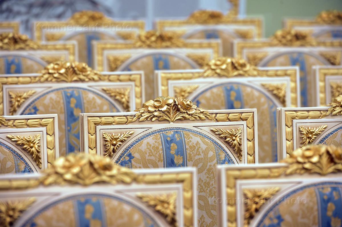Ежегодная встреча генерального прокурора России Юрия Чайки с членами Общественной палаты России прошла в здании Генеральной прокуратуры России. Пустой зал перед началом заседания.