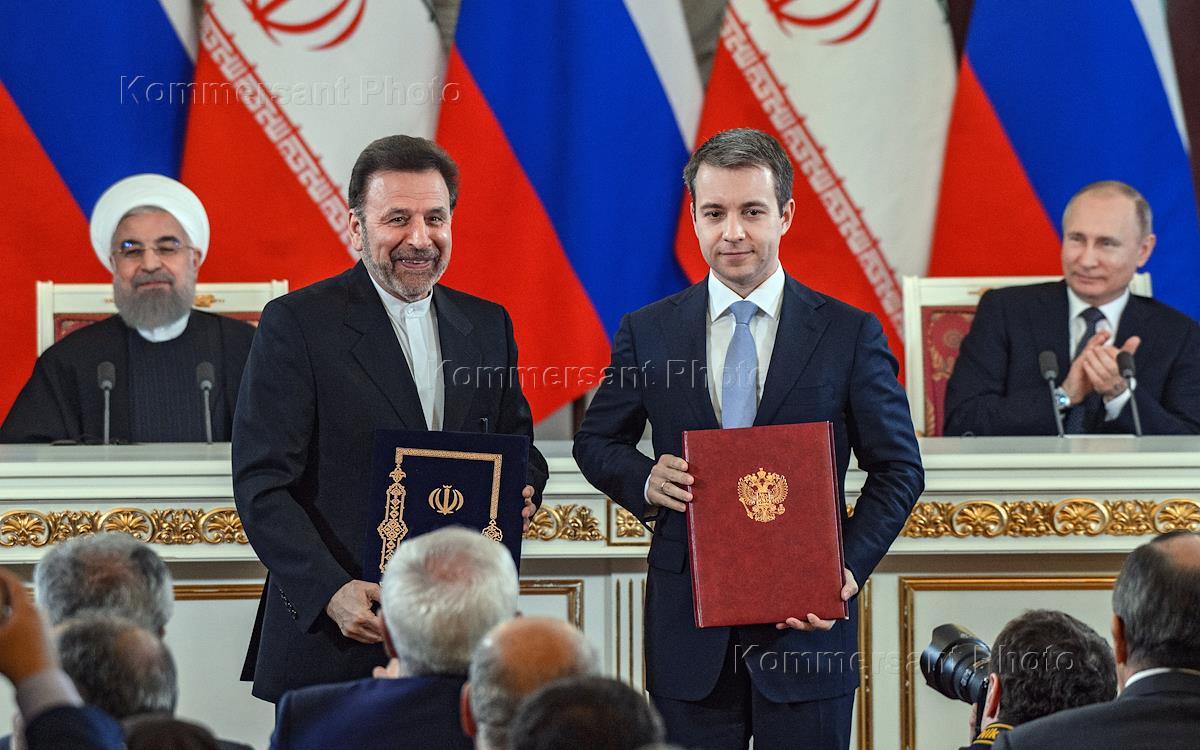 Церемония подписания документов по итогам российско-иранских переговоров в Кремле. Слева направо: президент Ирана Хасан Рухани, министр связи и информационных технологий Исламской Республики Иран Махмед Ваэзе, министр связи и массовых коммуникаций России Николай Никифоров и президент России Владимир Путин во время церемонии.
