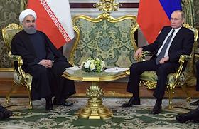 Президент Ирана Хасан Рухани (слева) и президент России Владимир Путин (справа) во время встречи в Кремле.