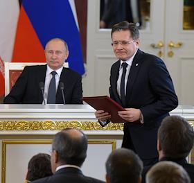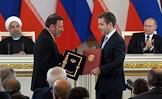 Встреча президента России Владимира Путина с президентом Ирана Хасаном Рухани прошла в Кремле. Министр юстиции России Александр Коновалов (слева) и председатель правления компании "Газпром" Алексей Миллер (в центре) во время встречи.
