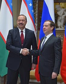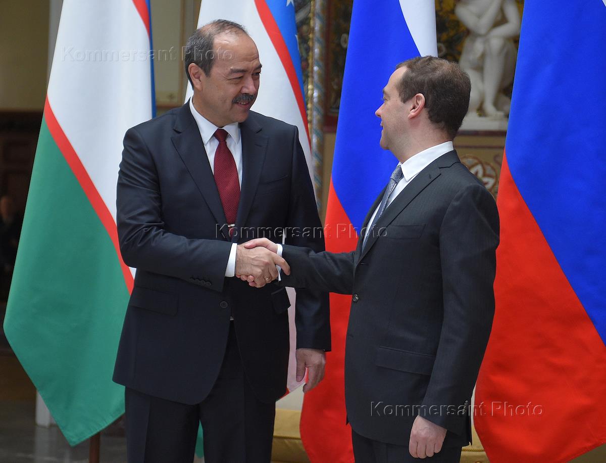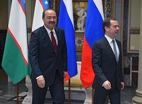 Председатель правительства России Дмитрий Медведев (справа) и председатель правительства Узбекистана Абдулла Арипов (слева) во время встречи.