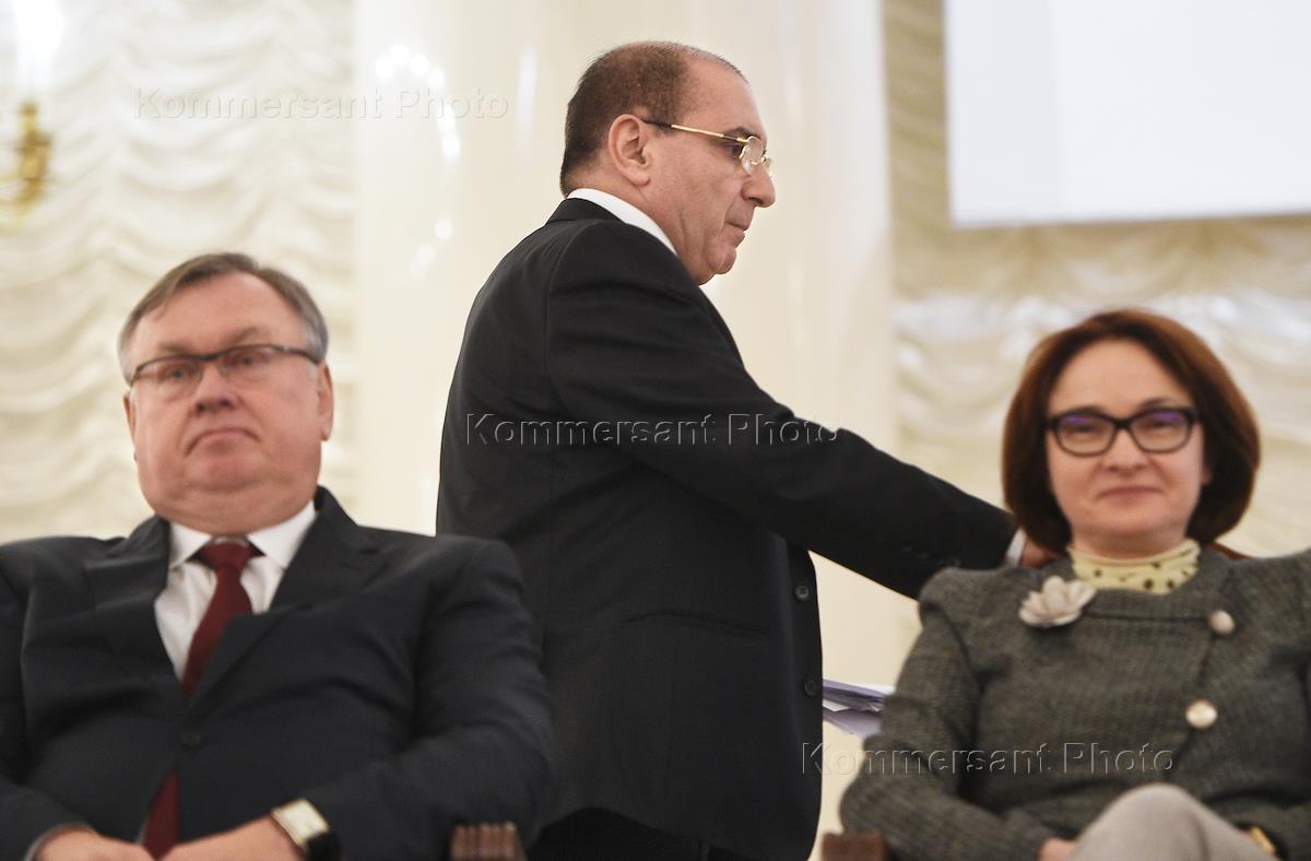 XXVIII съезд Ассоциации российских банков прошел в Колонном зале Дома Союзов. Слева направо: президент, председатель правления ПАО "Банк ВТБ" Андрей Костин, президент Ассоциации российских банков Гарегин Тосунян и председатель Центрального Банка России Эльвира Набиуллина во время съезда.
