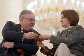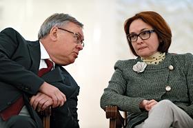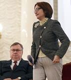 XXVIII съезд Ассоциации российских банков прошел в Колонном зале Дома Союзов. Председатель Центрального Банка России Эльвира Набиуллина (слева) и министр финансов России Антон Силуанов (справа) во время съезда.