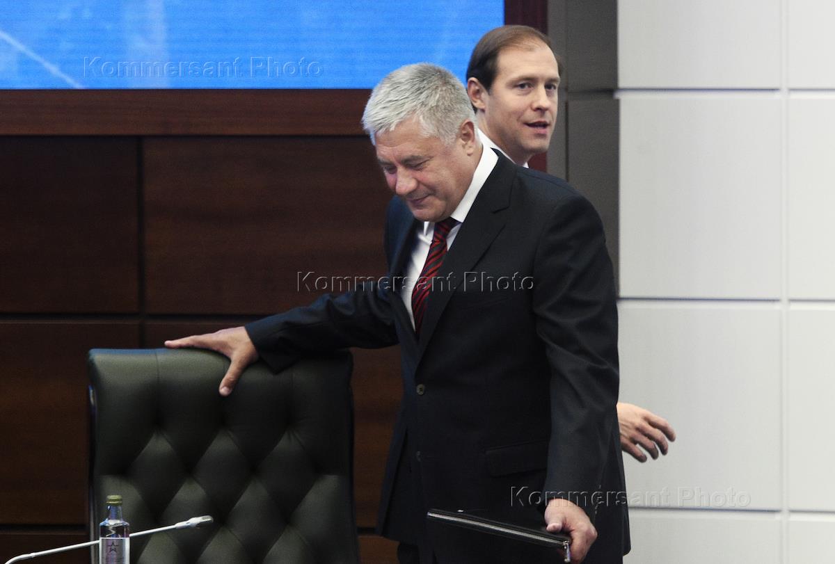 Заседание Государственной комиссии по противодействию незаконному обороту промышленной продукции под председательством министра промышленности и торговли России Дениса Мантурова прошло в Национальном центре управления обороной России. Министр промышленности и торговли России Денис Мантуров (слева) и министр внутренних дел России Владимир Колокольцев (справа) на заседании.
