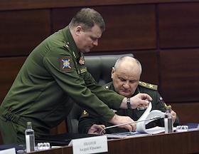Заседание Государственной комиссии по противодействию незаконному обороту промышленной продукции под председательством министра промышленности и торговли России Дениса Мантурова прошло в Национальном центре управления обороной России. Заместитель министра обороны России, генерал армии Павел Попов (слева) и министр промышленности и торговли России Денис Мантуров (справа) на заседании.