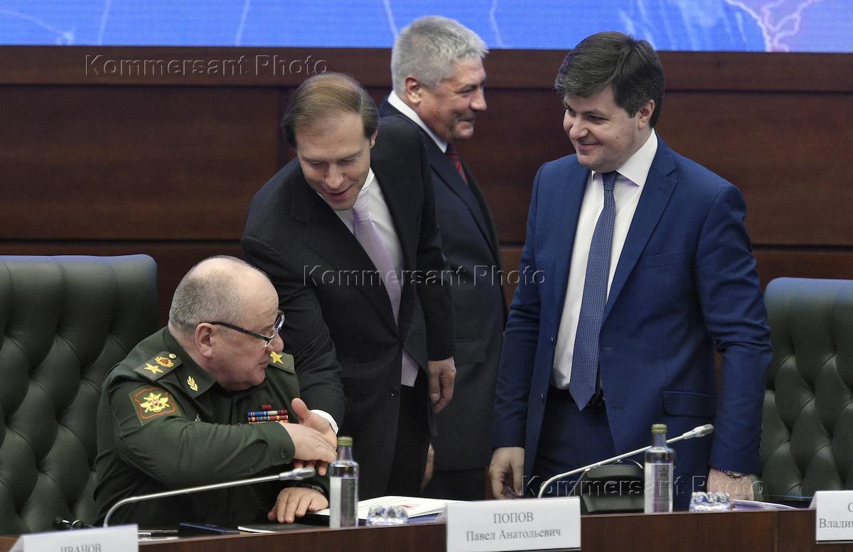 Заседание Государственной комиссии по противодействию незаконному обороту промышленной продукции под председательством министра промышленности и торговли России Дениса Мантурова прошло в Национальном центре управления обороной России. Слева направо: заместитель министра обороны России, генерал армии Павел Попов, министр промышленности и торговли России Денис Мантуров, министр внутренних дел России Владимир Колокольцев и начальник Экспертного управления президента России Владимир Симоненко на заседании.