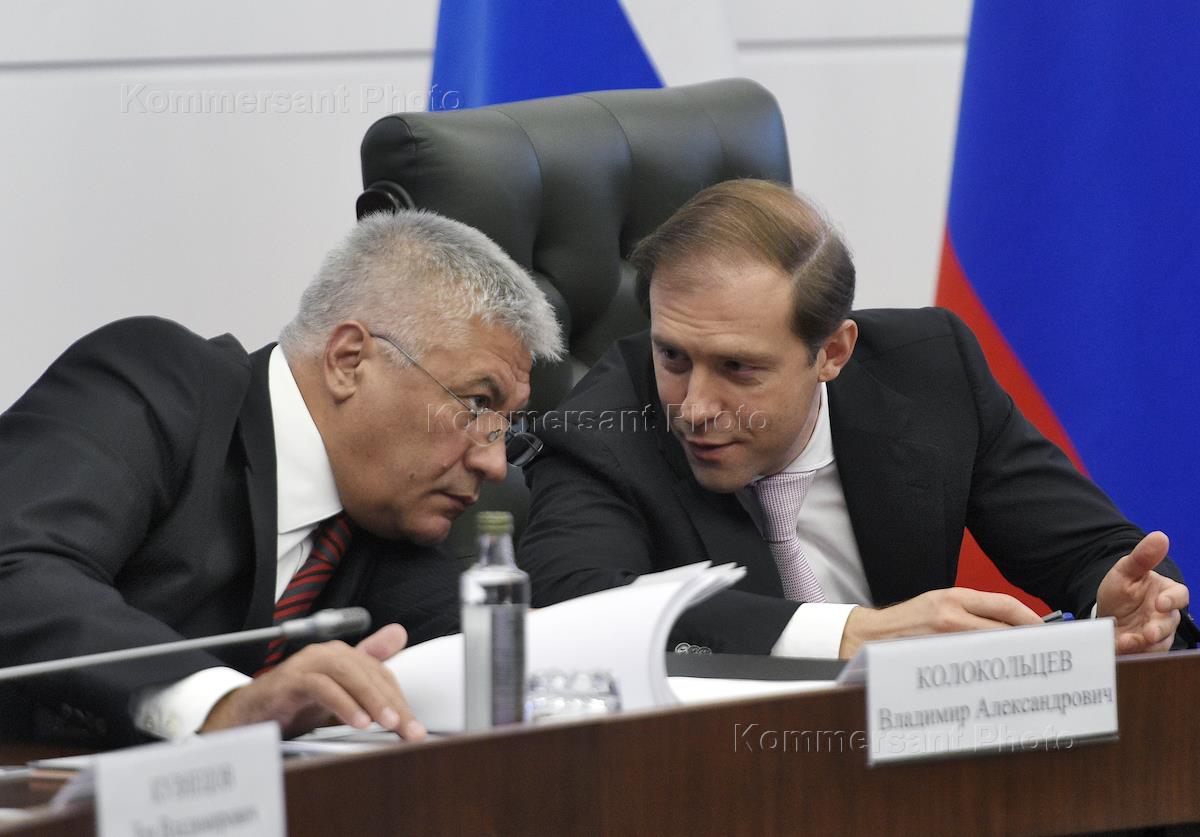 Заседание Государственной комиссии по противодействию незаконному обороту промышленной продукции под председательством министра промышленности и торговли России Дениса Мантурова прошло в Национальном центре управления обороной России. Министр промышленности и торговли России Денис Мантуров (слева) и министр внутренних дел России Владимир Колокольцев (справа) на заседании.