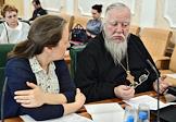 Парламентские слушания на тему "Концепция родительско-детских отношений в Семейном кодексе РФ" в Совете Федерации (СФ) России. Председатель Патриаршей комиссии по вопросам семьи, защиты материнства и детства Русской православной церкви (РПЦ) протоиерей Дмитрий Смирнов (слева) и представитель в СФ России от исполнительной власти Омской области Елена Мизулина (справа) во время слушаний.