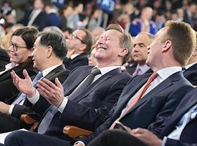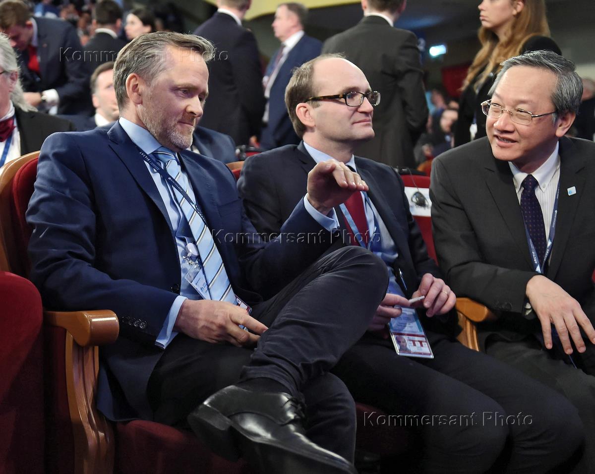 IV Международный Арктический форум "Арктика – территория диалога". Вице-премьер Госсовета КНР Ван Ян (слева), специальный представитель президента России по вопросам природоохранной деятельности, экологии и транспорта Сергей Иванов (в центре), министр иностранных дел Норвегии Борге Бренде (справа) во время форума.
